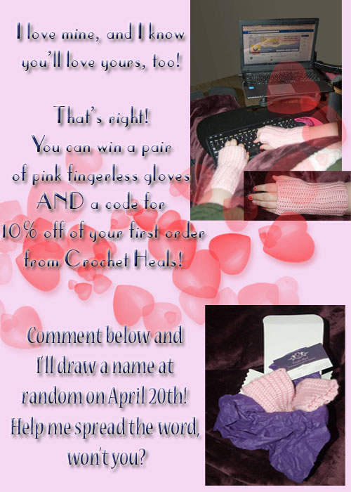 And now, YOU can win a pair of pink fingerless gloves, too, made by Cindy and new in the box!!