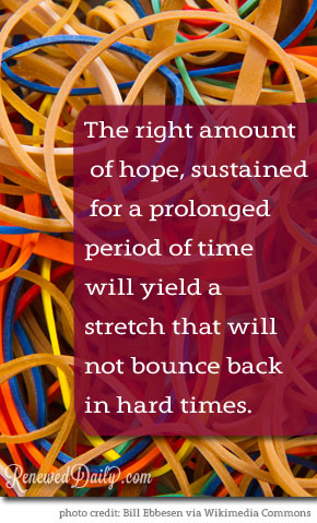 The right amount of hope, sustained for a prolonged period of time will yield a stretch that will not bounce back in hard times. We’ve all seen rubber bands that have been stretched around an item for a long time without breaking. Even when they are removed from the object, the elasticity in the band is diminished, so that the rubber remains the size that would be necessary to hold the same item again without having to stretch for it.