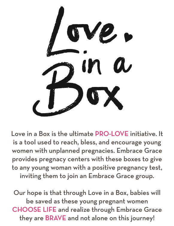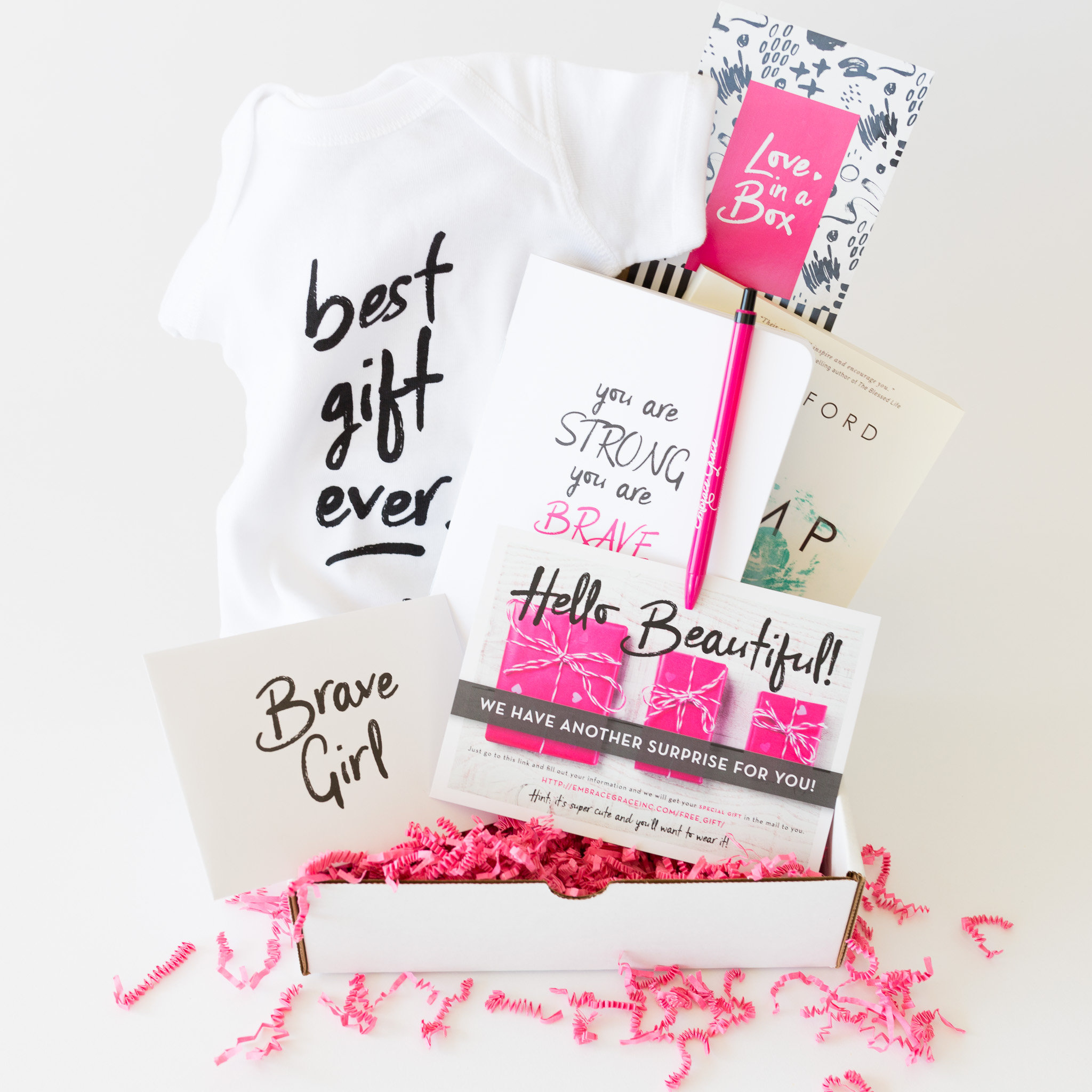 Boxes are distributed to pregnancy centers nation-wide and given to young, single women with positive pregnancy tests. The box is full of gifts that will inspire hope and impart love to a mom that may be scared for her future. Each box consists of a Fearless Journal and pen, a Bump in Life book, a baby onesie, testimonial letters of girls that chose adoption and chose to parent, an invitation to join an Embrace Grace group and a Brave Girl letter that can be written by YOU!