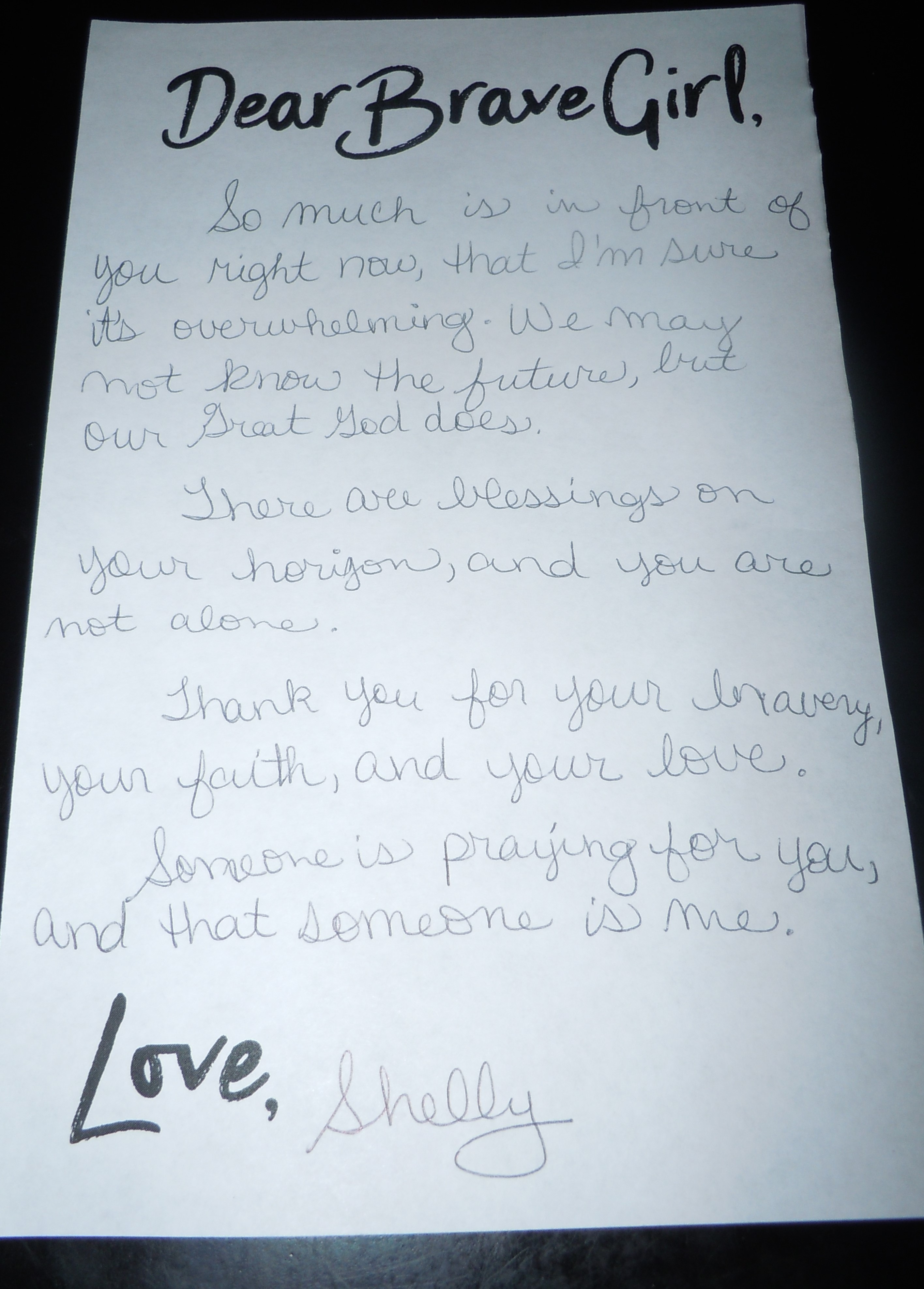 Download and print our brave girl letter (http://egrace.co/brave) and mail to address below for us to place inside a Love in a Box. You can mail your Brave Girl letter to: Embrace Grace, Inc. Attn: Love in a Box 700 W. Bedford Euless Rd., Ste. G Hurst, TX 76053 Here’s my letter, about to be sent off to an overwhelmed heart!